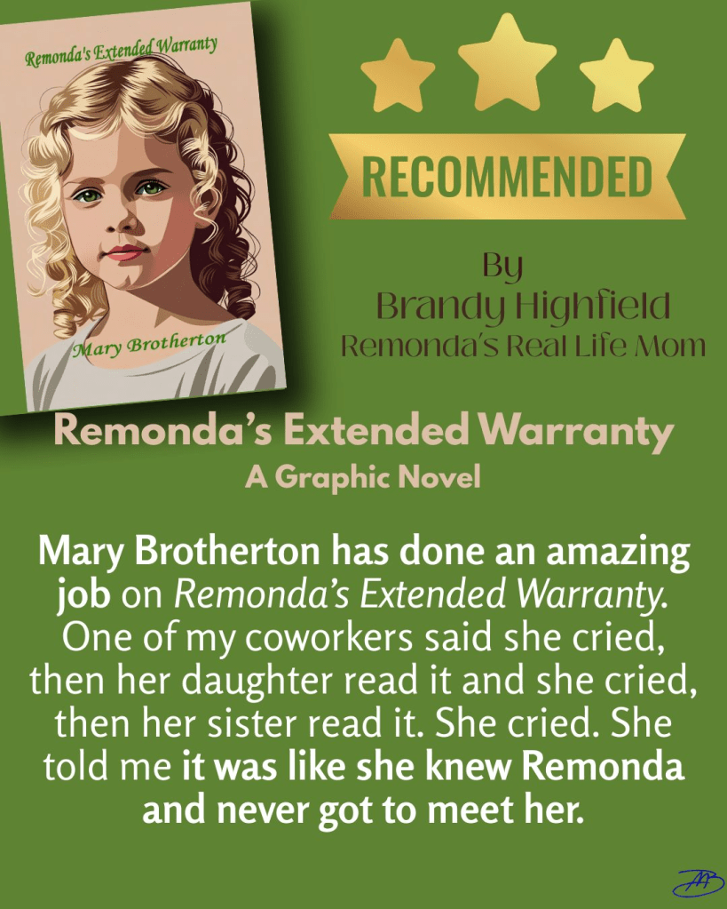 Remonda’s Extended Warranty is a graphic novel based on a true story. Remonda was thirteen years old when she died from an asthma attack. Her parents made the selfless decision to donate her organs so others would have a second change to live. Hence the name of the book. This book can be read by all ages. Her extended warranty continues to this day.
